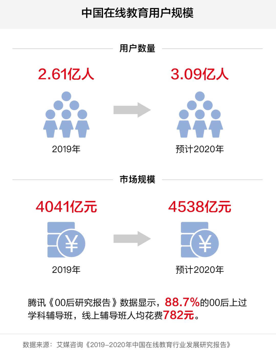 據(jù)艾傳媒咨詢《2019-2020中國在線教育產(chǎn)業(yè)發(fā)展研究報告》顯示,2019年中國在線教育用戶規(guī)模達(dá)到2.61億,市場規(guī)模達(dá)到4041億元。預(yù)計2020年中國在線教育用戶規(guī)模將達(dá)到3.09億。市場規(guī)模將達(dá)到4538億元,同比增長15.5%;騰訊《00后研究報告》顯示,88.7%的00后學(xué)生參加過學(xué)科輔導(dǎo)班,在線輔導(dǎo)班平均費(fèi)用為782元。