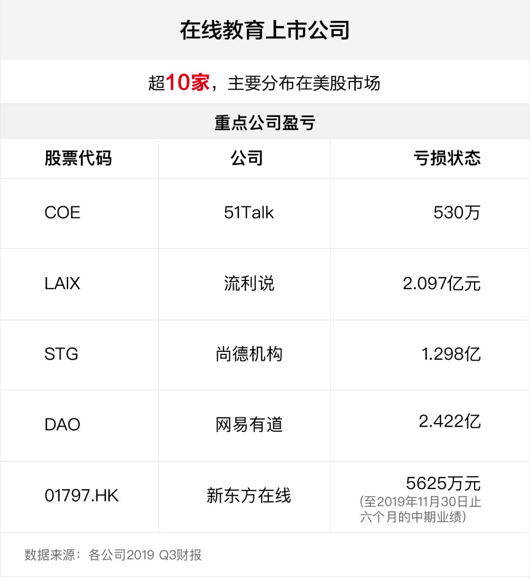 記者注意到,目前成功上市的網(wǎng)絡(luò)教育公司有10多家,大部分集中在美國股市。根據(jù)已公布的2019年第三季度財報顯示,流利談話、51Talk、尚德、新東方在線等知名公司均出現(xiàn)不同程度的虧損。